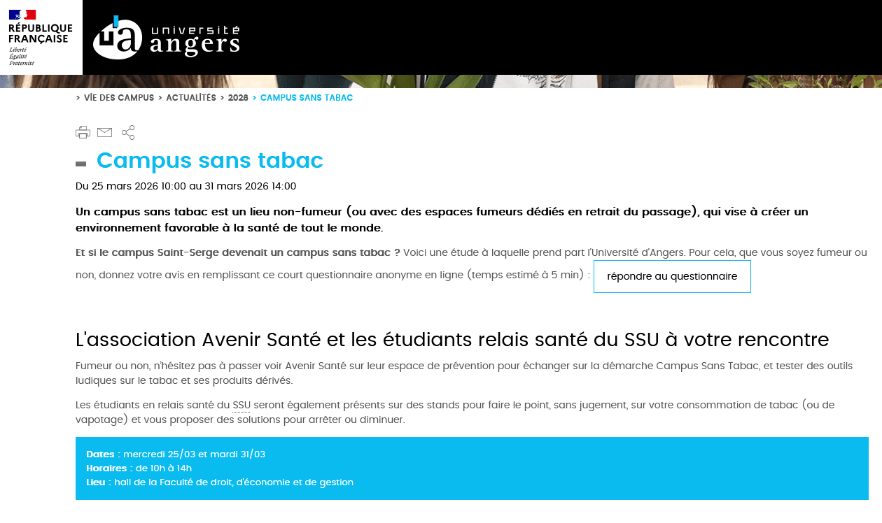 « Un campus sans tabac est un lieu non-fumeur (ou avec des espaces fumeurs dédiés en retrait du passage), qui vise à créer un environnement favorable à la santé de tout le monde. Et si le campus Saint-Serge devenait un campus sans tabac ? Voici une étude à laquelle prend part l’Université d’Angers. »